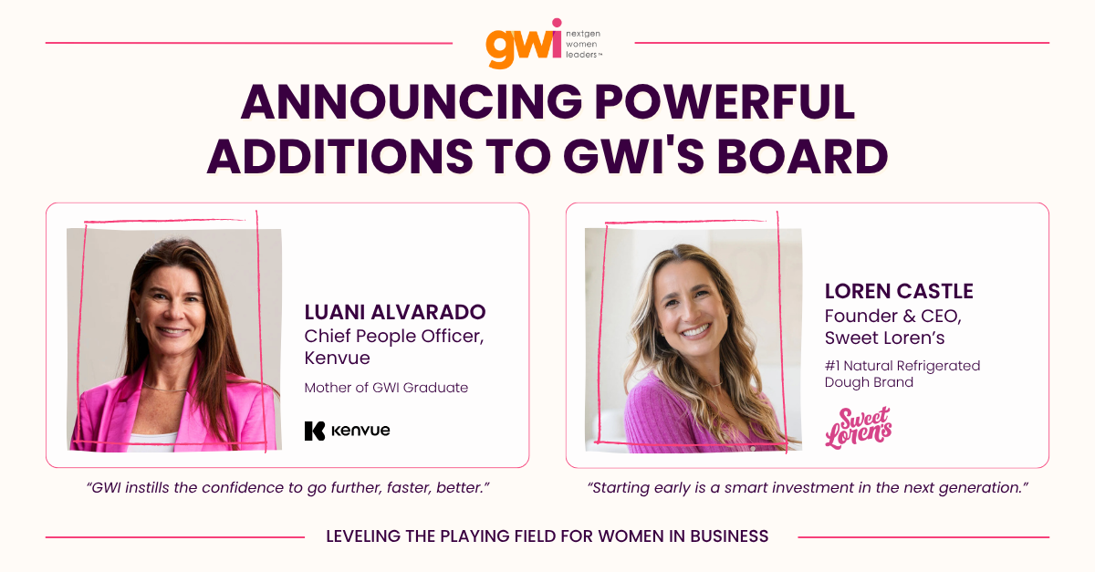 Greenwich, CT – Girls With Impact (GWI), the leading business and leadership training program for young women entering the workforce, today announced the addition of Luani Alvarado, Chief People Officer of Kenvue—the makers of Neutrogena ®, Listerine ® and BAND-AID ® Brand—and Loren Castle, Founder & CEO of Sweet Loren’s, to its Board of Directors.